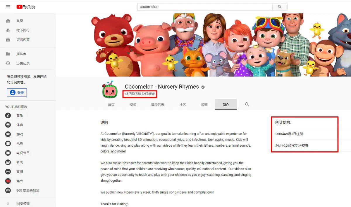 Cocomelon,国内比较少人知道这个节目,但在国外Youtube,很火热的,该节目从2006年开始在Youtube上发布,目前在Youtube网站上,播放量达到280亿次。