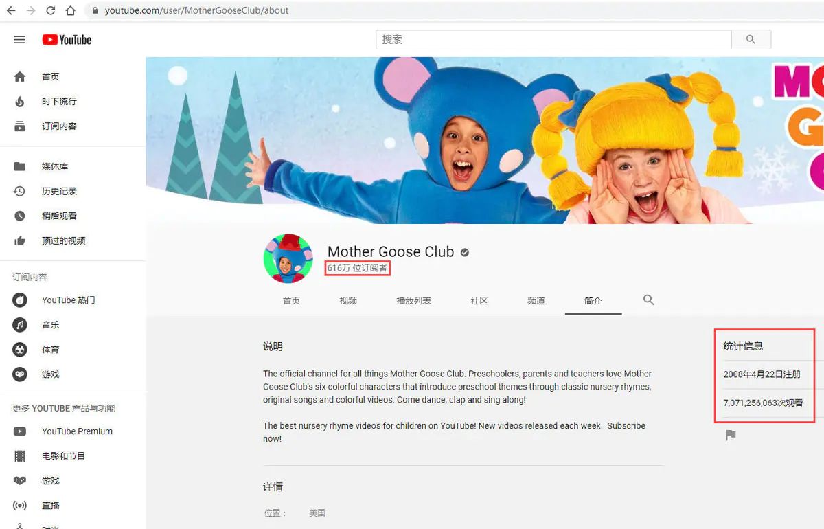 Mother Goose Club从2008年开始在国外Youtube平台上线发布,目前总共有616万的订阅量,播放量达到70亿次。