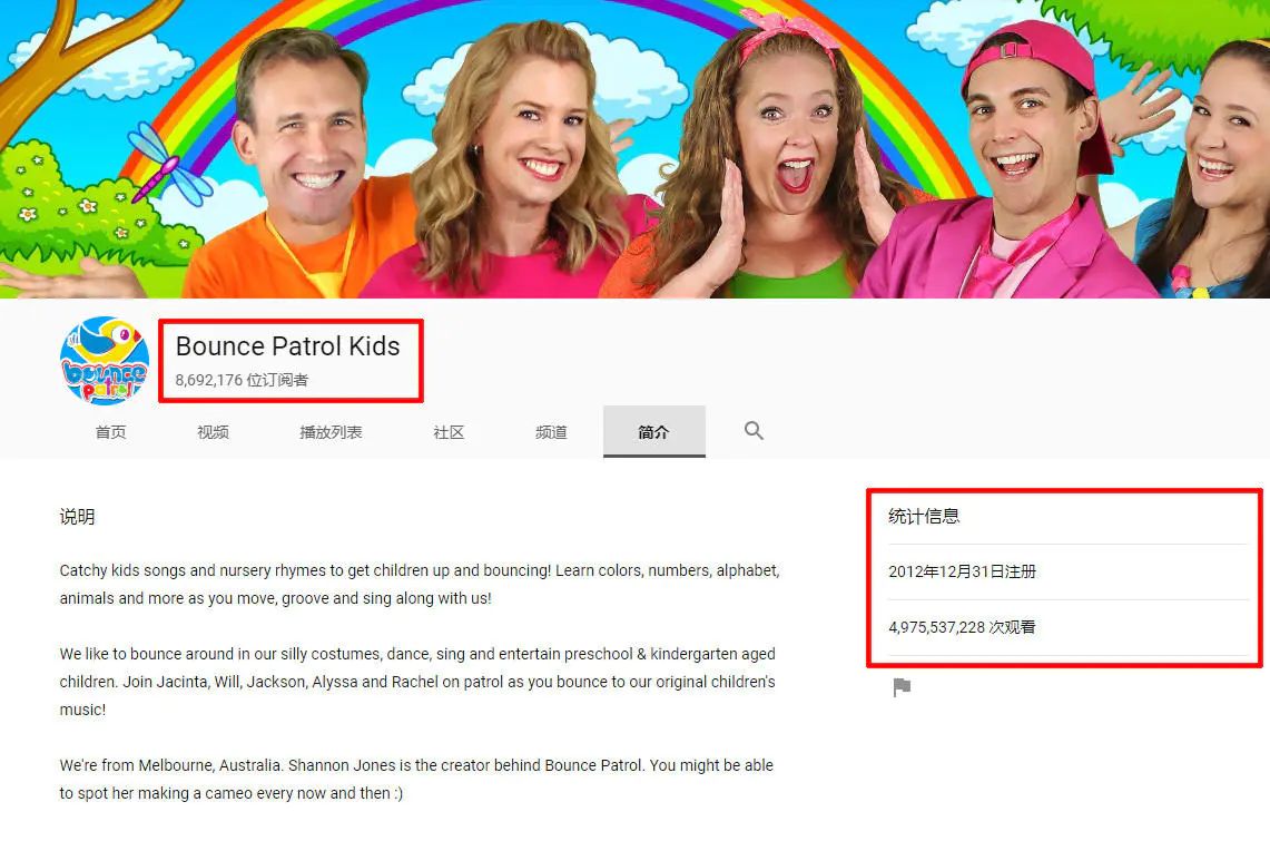 Bounce Patrol Kids是来自澳大利亚墨尔本的儿童娱乐团体,为儿童创建有趣的教育视频,在油管的订阅量从开始的300万剧增到目前1200万就可以看出其实受欢迎程度。其风格主要通过五个主角欢快的舞蹈,镶嵌入单词,在带动孩子,让孩子不知不觉中学会单词,包括颜色、数字、字母、节日、身体部位等基本概念。