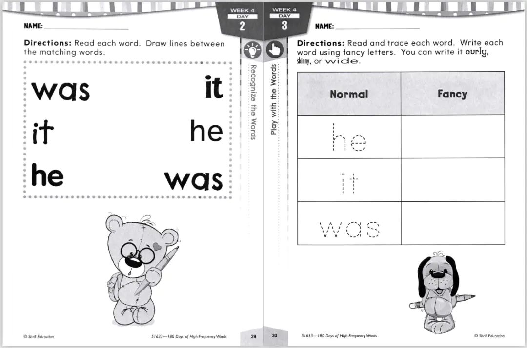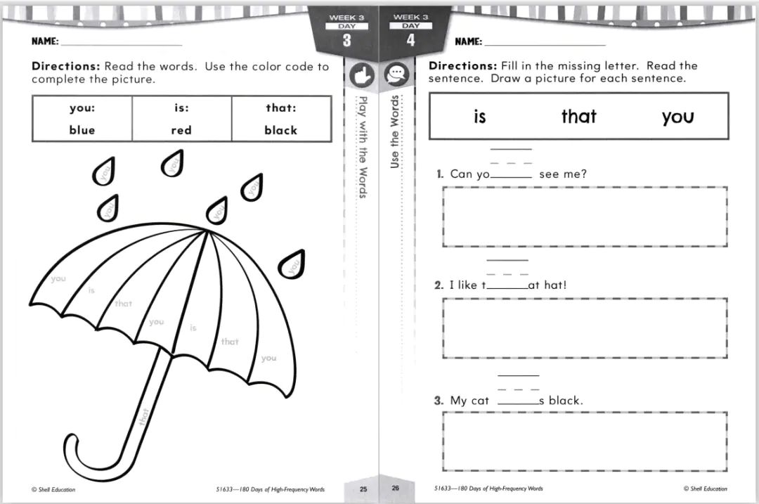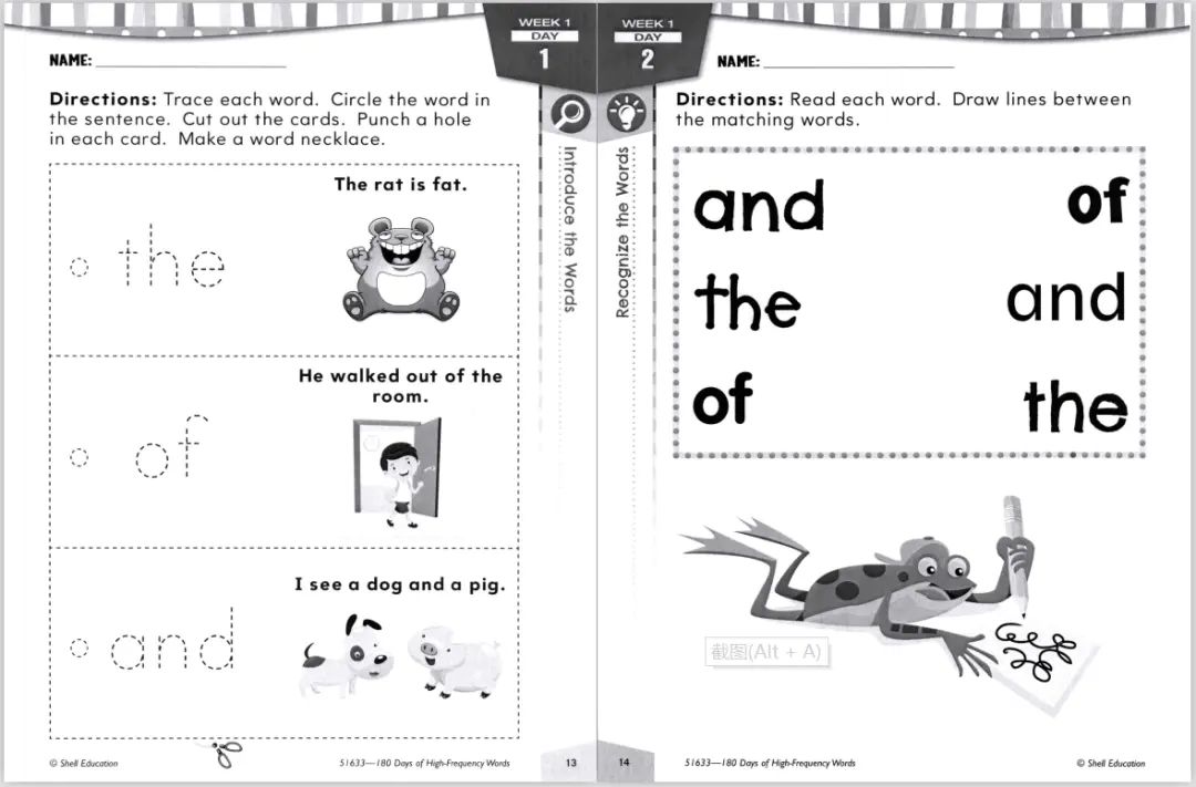 每周引入三个单词,每个新词按照引入-识别-游戏-运用-书写5个环节来展开,练习形式多样化,包括描红、涂色、连线、画圈、填空、书写、画画、选词填空和写作等等。