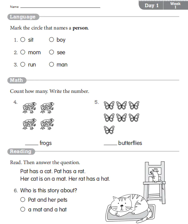 第一天:识别名词里的person、数动物的个数,阅读部分重在练习阅读自然拼读short a 的一些CVC单词组成的句子,以及简单的问题。