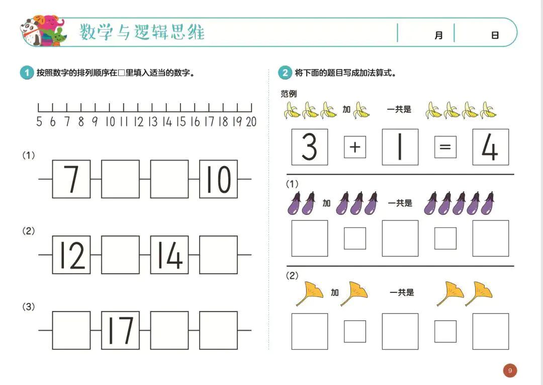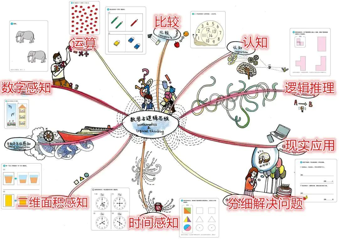 <数学和逻辑思维>套系的联系体系,则是围绕着孩子学前必须掌握的逻辑和数学技能展开,着力训练孩子数字感知、时间感知、方向与方位感知、运算、比较、逻辑推理、现实应用、分析解决问题等方面的能力。