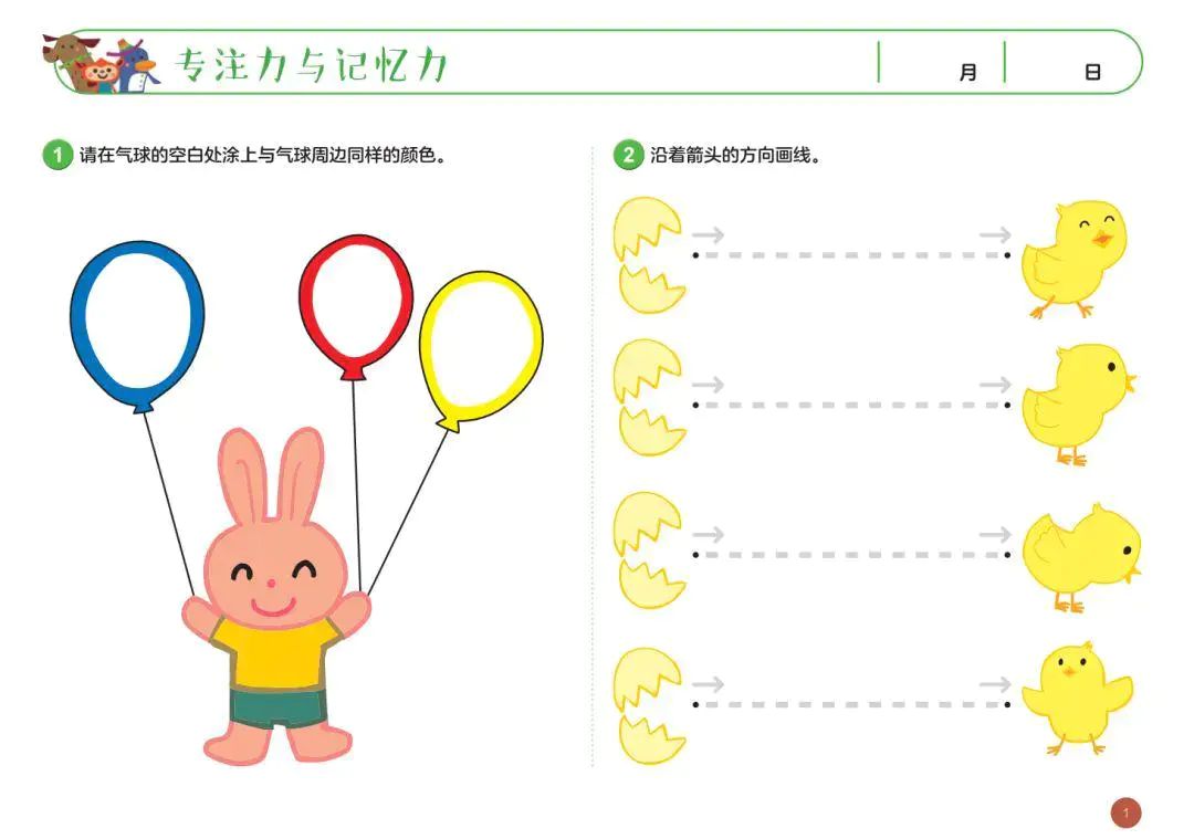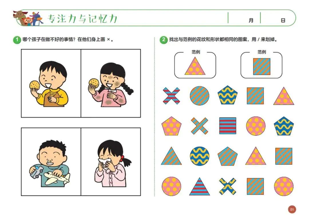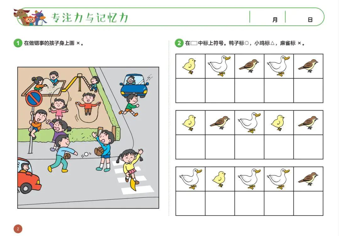 『专注力与记忆力』套系每页都是1道记忆力题+1道专注力题的题型安排,通过这样的交叉训练,潜移默化地来提升孩子的专注力与记忆力,让孩子真正变得“更聪明”。