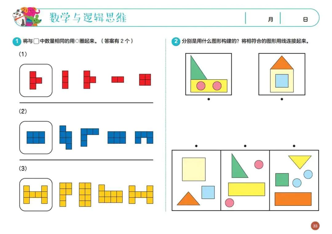 另外,4~5岁分册中同时加入了钱币、时间等生活概念,从平面图形逐渐过渡到立体图形,巩固比较的概念等。