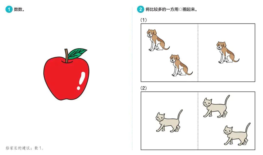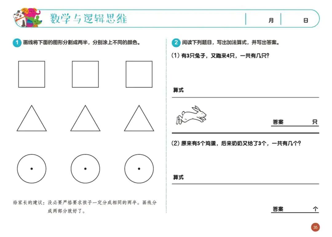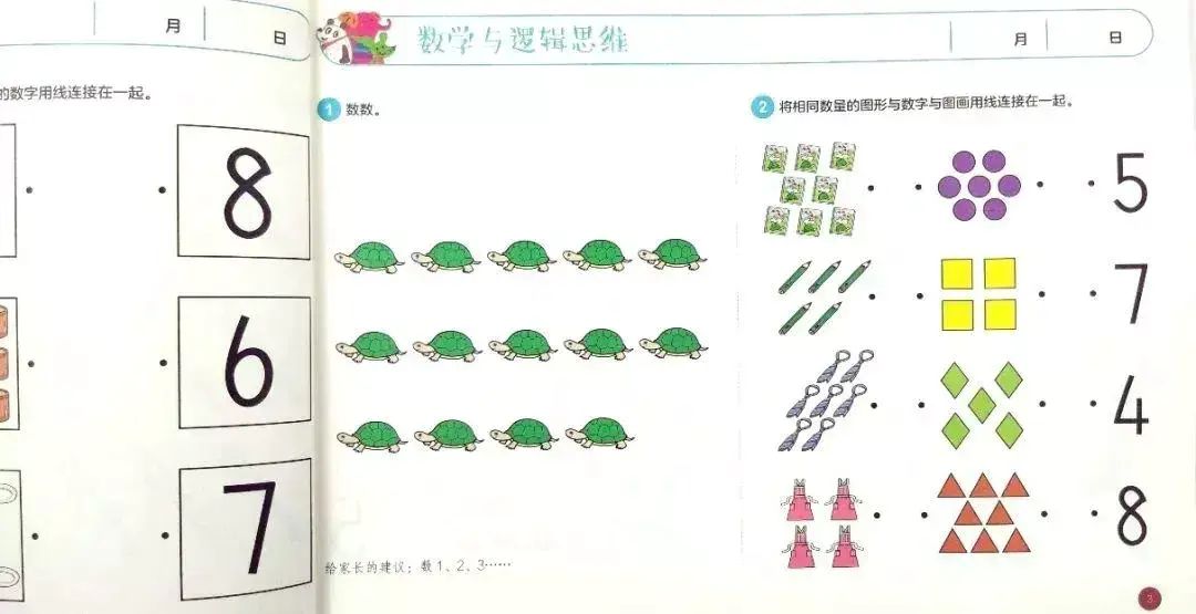 在3~4岁的分册中,孩子将认识1~20的数字,以及感知理解数和量的关系,同时还要学习的合成与分解,认知图形等。