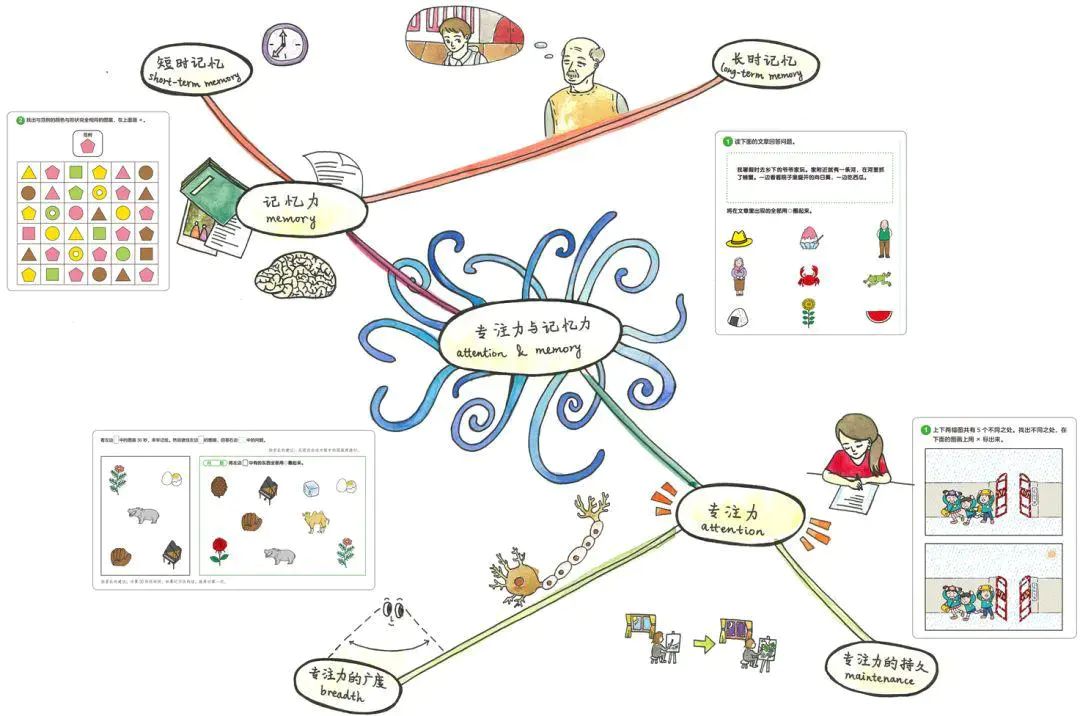 <专注力与记忆力> 套系的练习体系,大家可以看下下面这张思维导图,是围绕着记忆力和专注力两大块内容分别展开的。其中记忆力部分,是以训练短时记忆和长时记忆为核心,而专注力部分,则结合了专注力的广度和持久训练两个部分 。