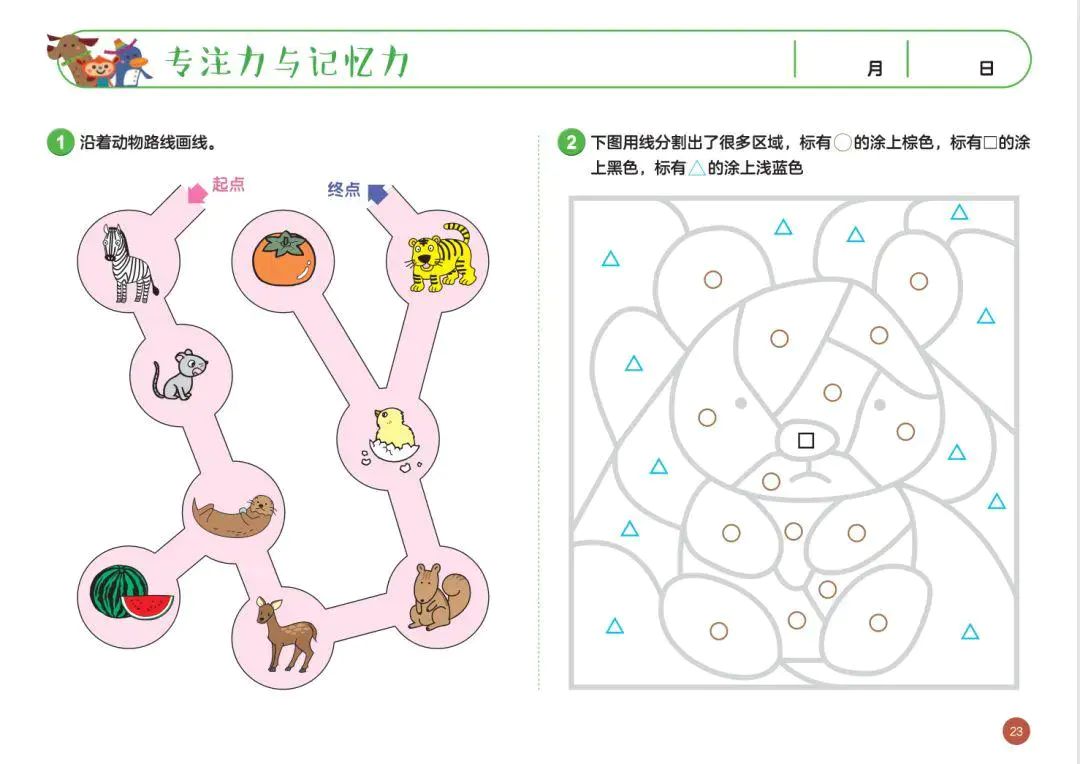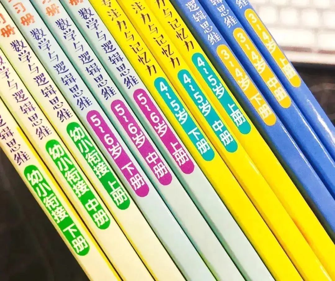各年龄段的不同套系,还会按难度划分成上、中、下三册,也就是说,每个年龄段都各有3册<专注力与记忆力>和3册<数学和逻辑思维>,3册的难度逐层递增。