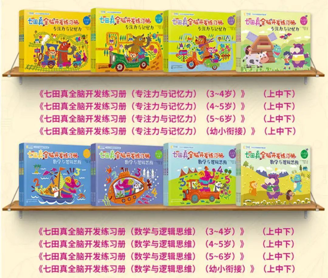 每个年龄段各含3本【专注力与记忆力】与3本【数学和逻辑思维】,分为上、中、下三册,总计6本。