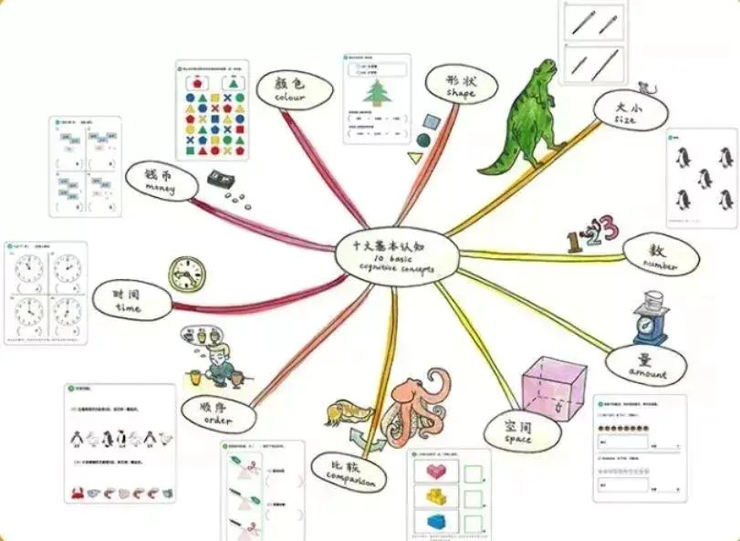内容上涵盖了孩子进入小学前应会的十大基础概念,包括:时间、空间、形状、大小、比较、顺序、颜色、数、量、钱币。