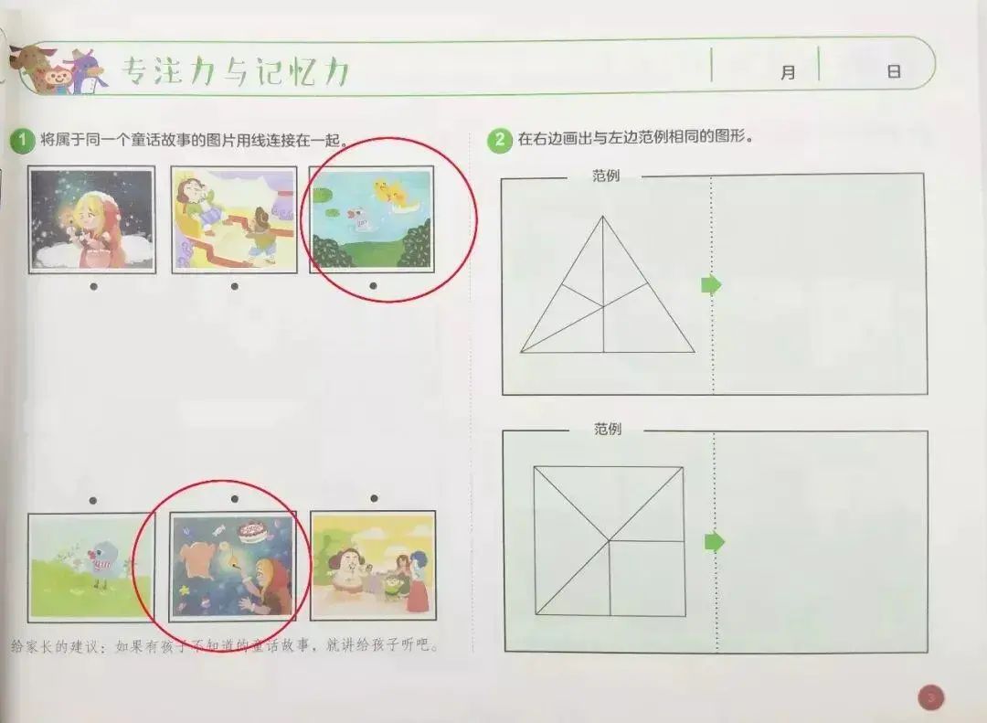 比如下面这题,需要孩子记住左边的范例后,遮住左边,在右边圈出左边的细节。这考验的就是专注力广度: