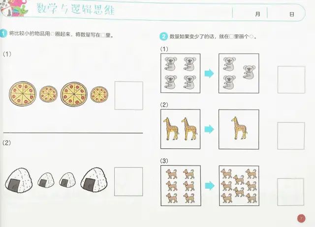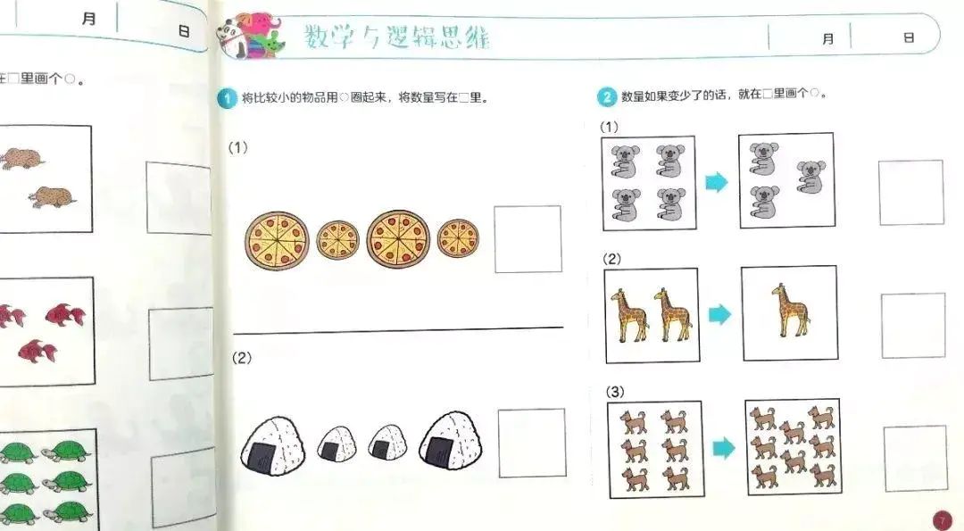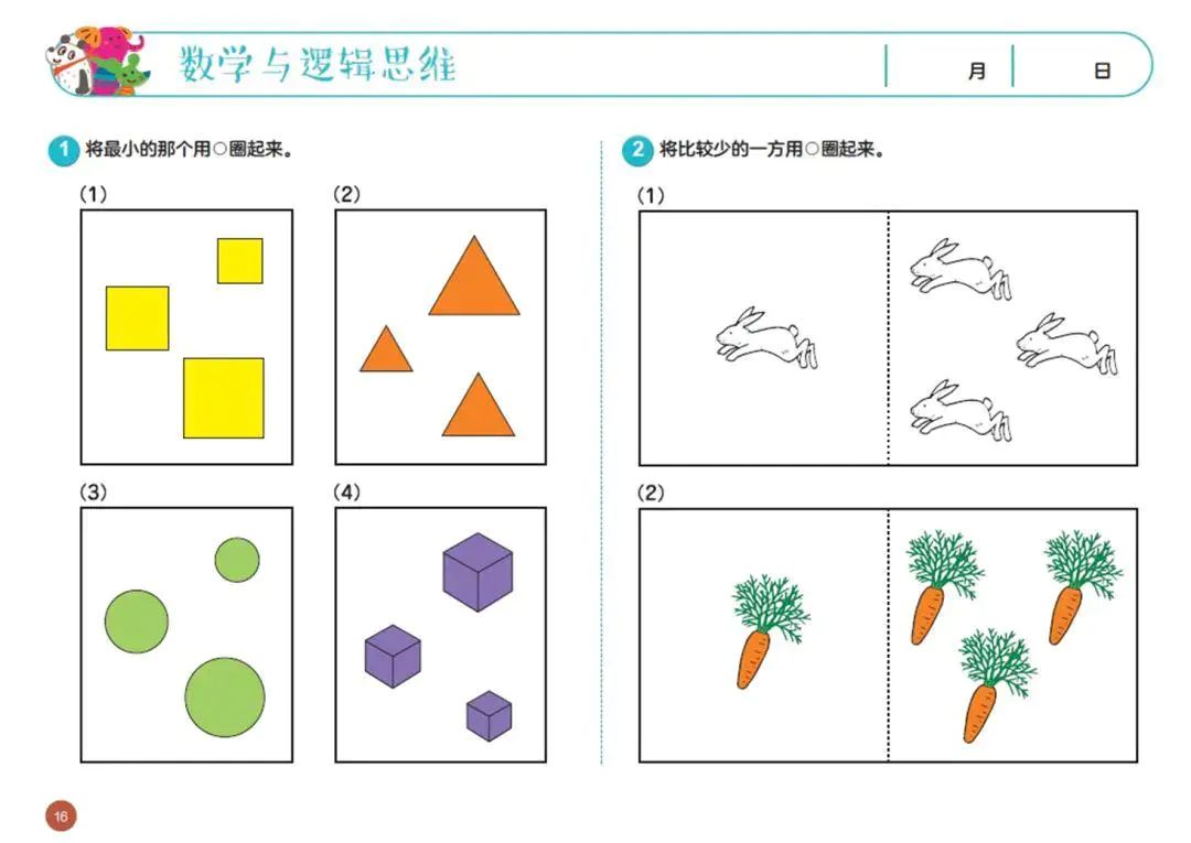 『数学与逻辑思维』分册,练习内容包括有认识数字与数量、时间、方位、比较、运算、逻辑推理等等,但它着力点的并不是通过刷题来累积数学认知,而是让孩子从练习题中去发现生活中的数学,对数学产生兴趣。