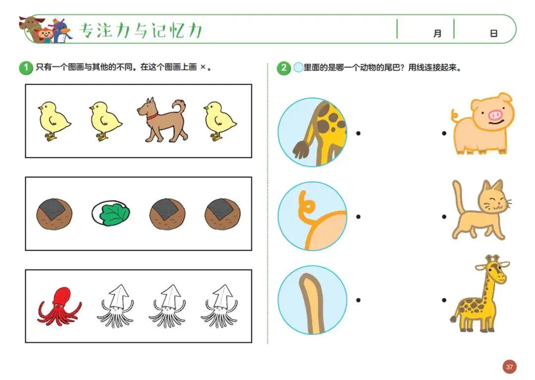 『专注力与记忆力』套系,内容以锻炼孩子的短时记忆和长时记忆能力、以及专注力的广度和持久性为主。
