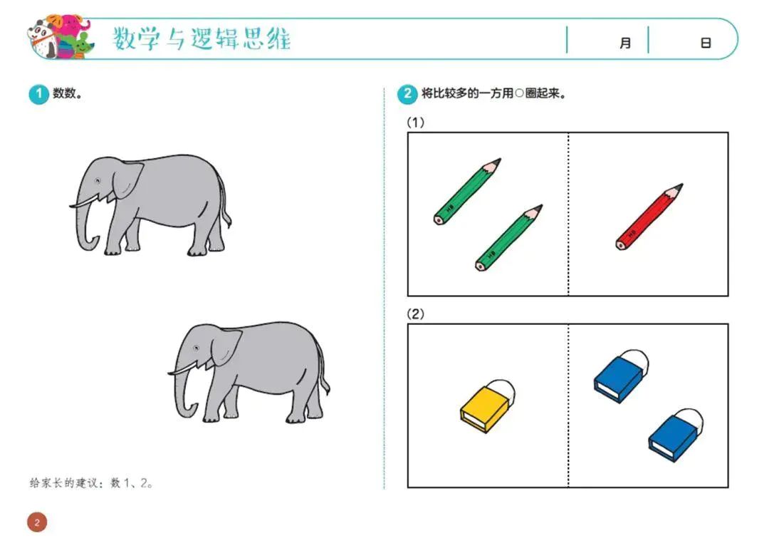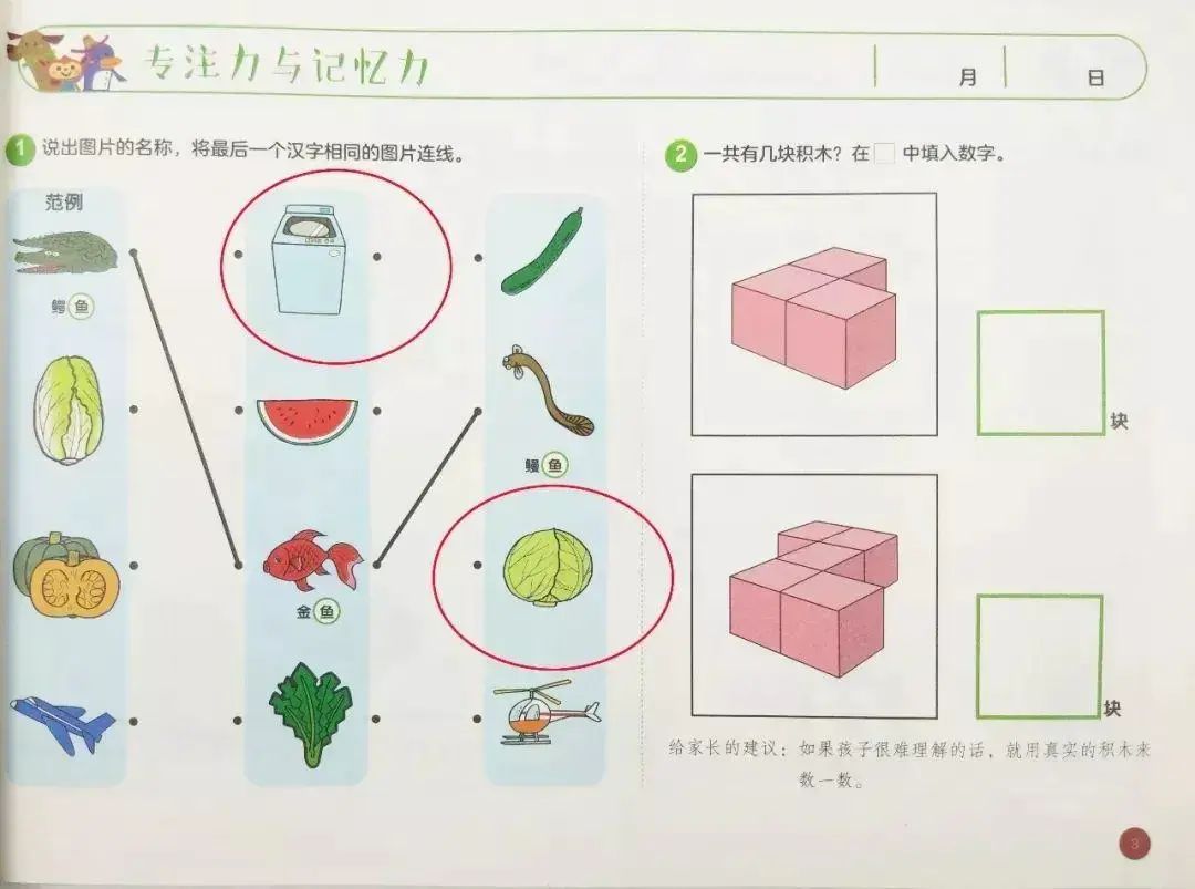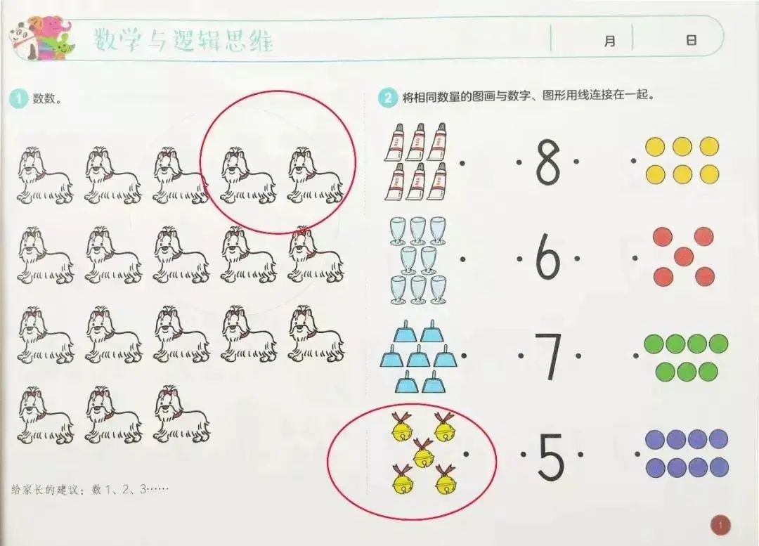 如果遇上需要娃儿圈出正确答案的题,而娃儿还不会画圈的情况,也没关系,只要孩子用手指指出答案,爸妈帮忙画一下圈就好,我们的主要目的还是让孩子来练习这些内容,当然后期就需要孩子尝试自己动手,毕竟这也能很好地锻炼到孩子的握笔能力。