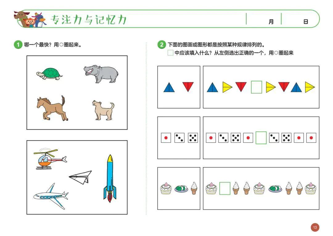 短时记忆,就是保持在一分钟以内的记忆。短时记忆的练习题,需要孩子利用当下所存储的记忆,来做出正确的选择。