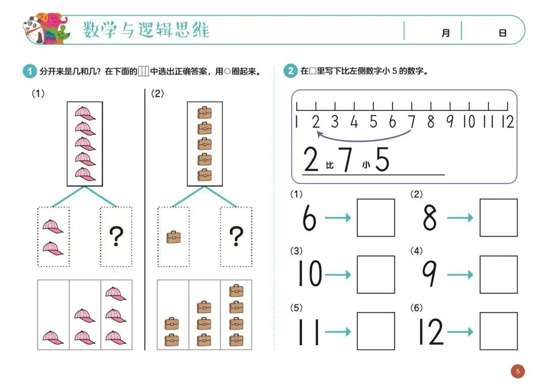 到了5~6岁分册时,1~100以内的数字都有,终于正式开始接触10以内的运算,并且前面实物化的呈现方式开始转变为抽象的列算式,已经跟小学要求数学能力差得不远了。